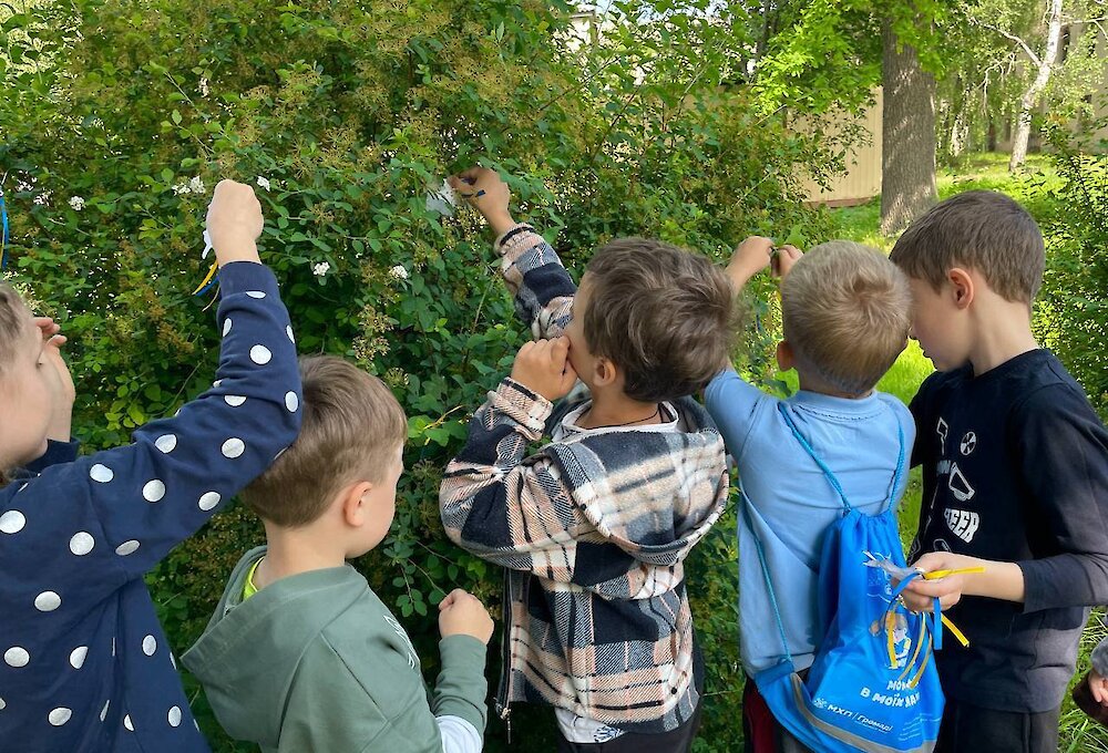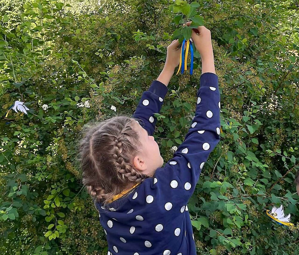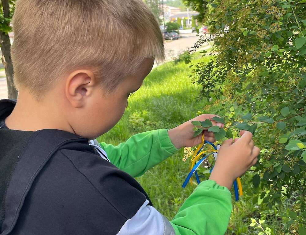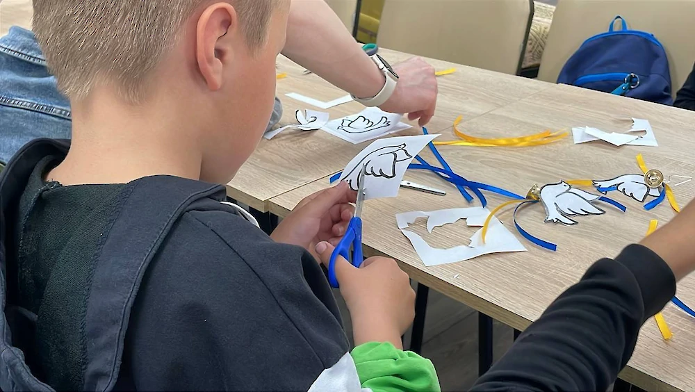 Школярі власноруч виготовили паперових голубів — символи світлої пам’яті про загиблих дітей. Їхні вироби розмістили у парку біля бібліотеки як знак скорботи та спільної надії на мирне майбутнє.
