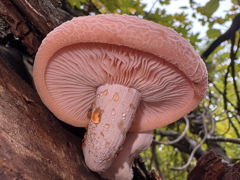 За її словами, під час прогулянки лісом вона помітила на краю дороги, на поваленій колоді, яскраво лососево-рожевий плодовий організм, про який мріяла багато років.