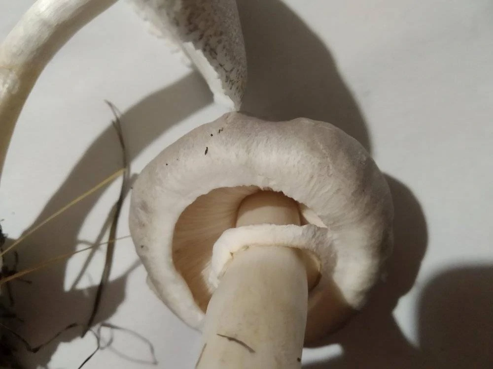 Посмотрите, какая длинная тонкая ножка,и белые пластинки под шляпой!
