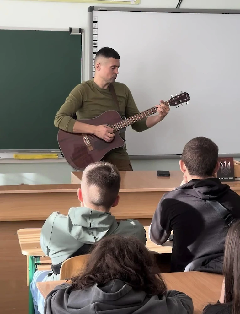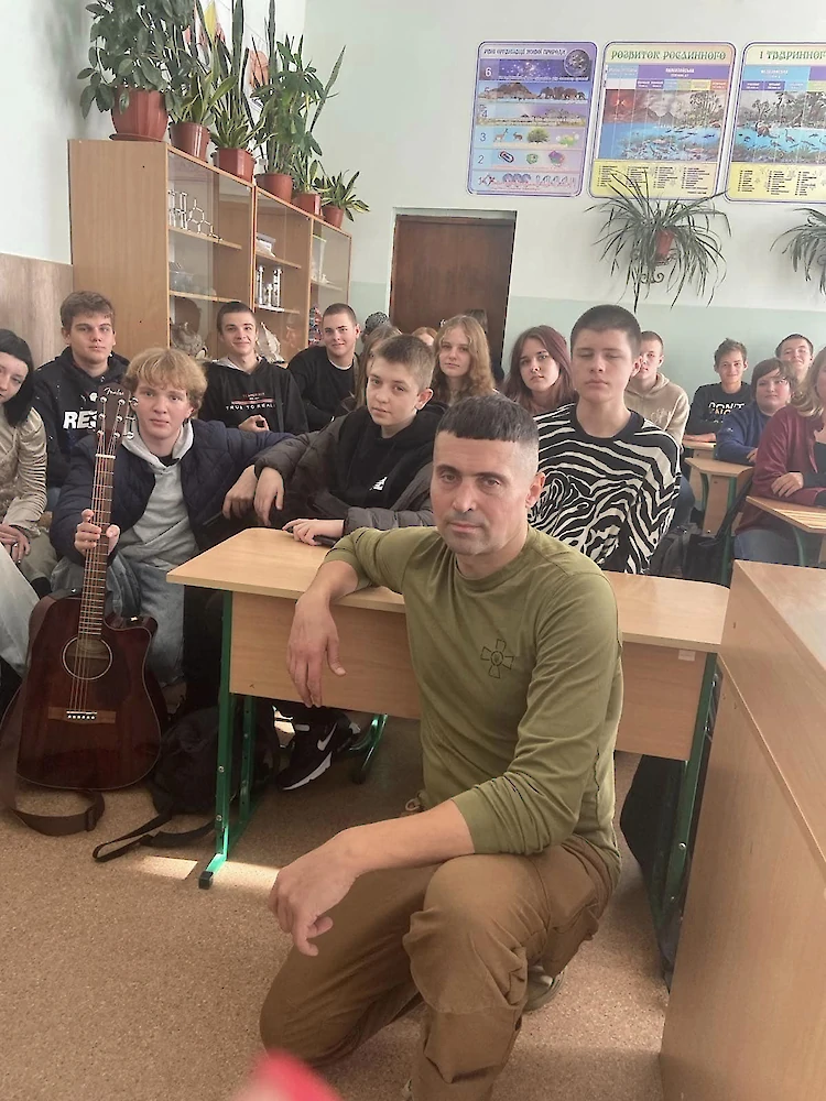 Во время встречи со старшеклассниками актер и воин обратился к ученикам со словами, полными гордости за Родину, за свой народ, за Вооруженные силы Украины.
