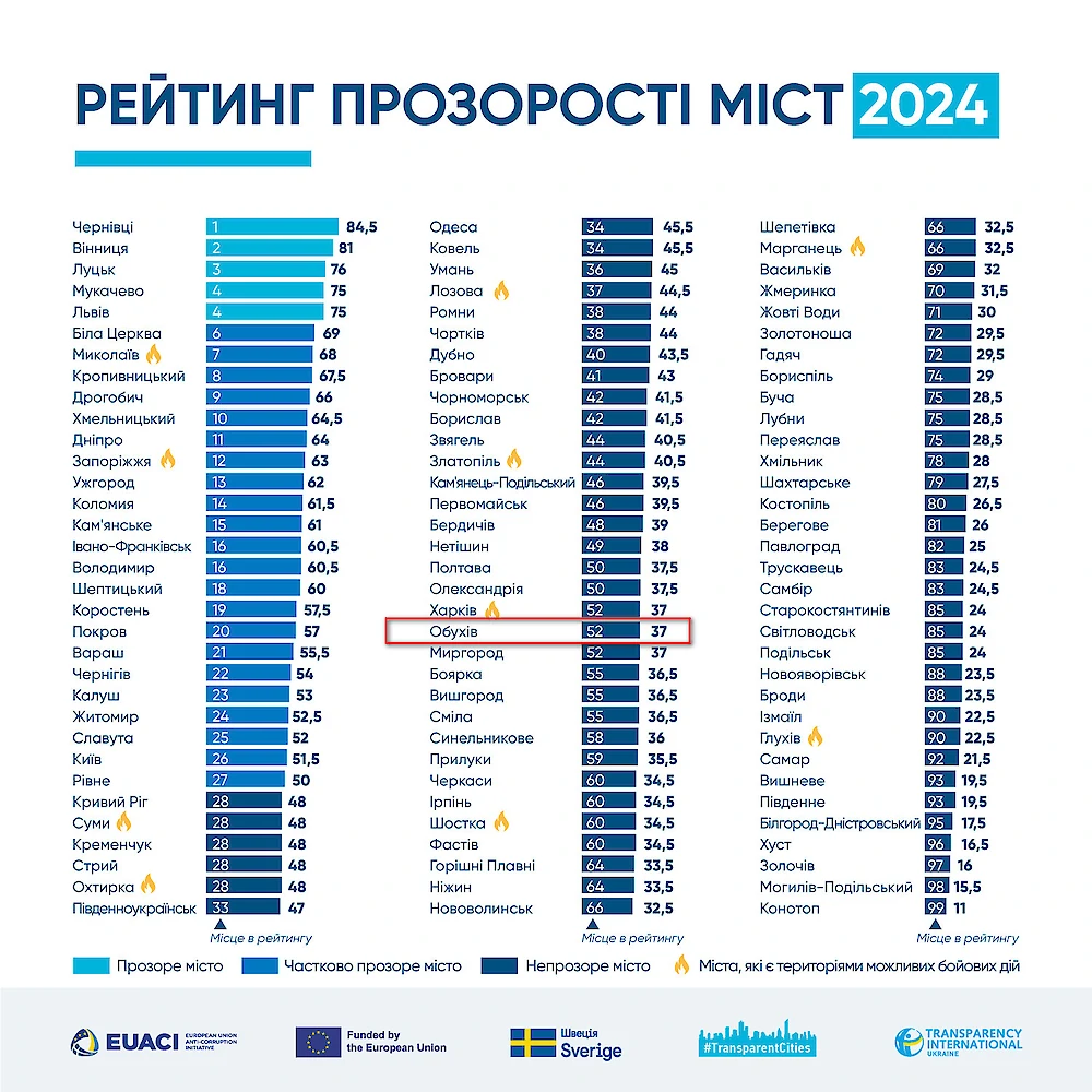 Обухов, который относится к Киевской области, снова оказался в перечне непрозрачных городов, набрав всего 37 баллов из 100 возможных. Для сравнения, самый высокий результат в нынешнем рейтинге - 94,5 балла (Ивано-Франковск), средний балл по стране - 47.