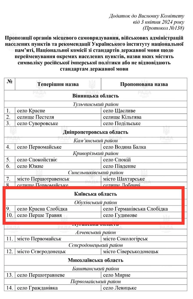 Согласно приложению к Заключению Комитета, в перечне населенных пунктов, названия которых рекомендованы к переименованию, есть два села из Обуховской общины. Новые названия: