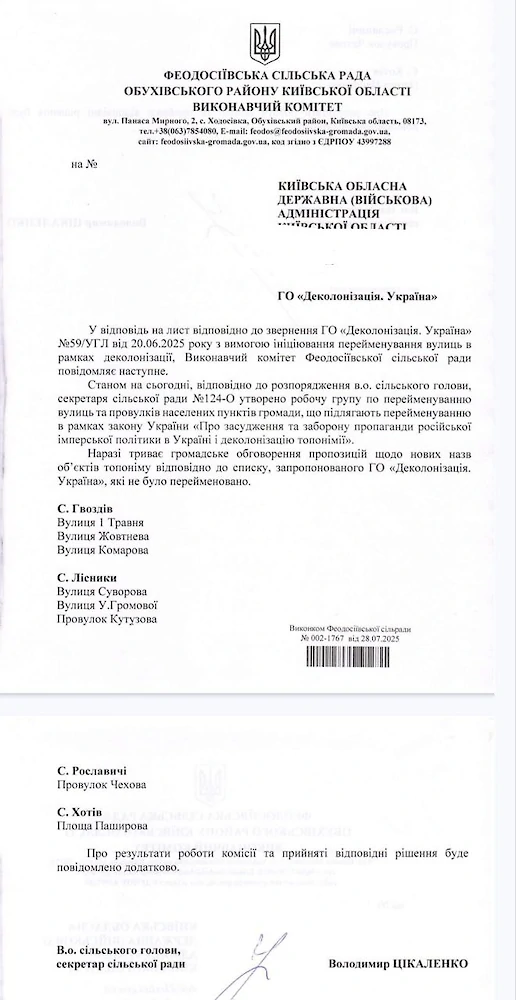 В сельсовете сообщили, что сейчас продолжается общественное обсуждение новых названий для этих улиц. Предложения рассматриваются в соответствии со списком, предложенным ОО "Деколонизация. Украина".