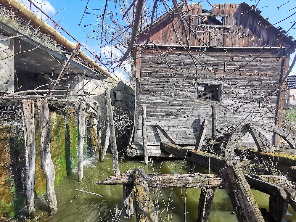 Мельница, предположительно деревянная, неоднократно ремонтировалась. Местные жители, в частности Анатолий Плахотний (экс-глава колхоза) и его жена Тамара Семеновна (1940-х г.р.), подтвердили, что мельница работала до Второй мировой войны, претерпела несколько реконструкций, последняя - в 1990-х. Легенд или историй, связанных с мельницей, не сохранилось.